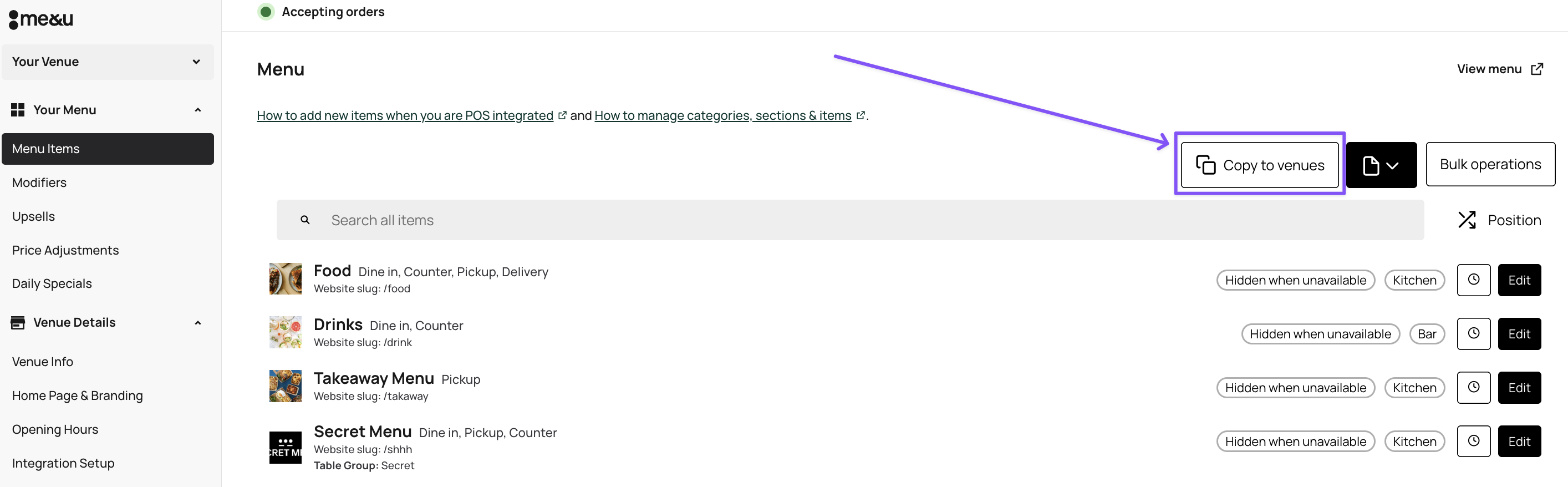 The bulk menu editing feature lets you copy menu setups from one venue to many others in one go.