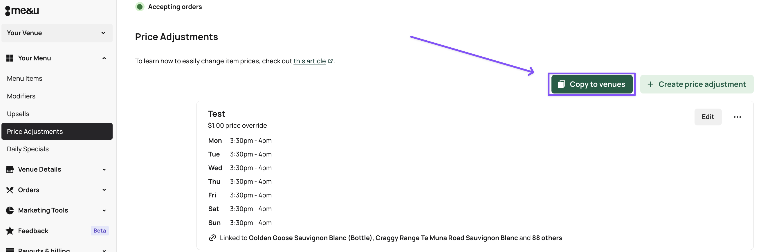 - Copy to venues → pick Price Adjustment Groups → select venues → Review.