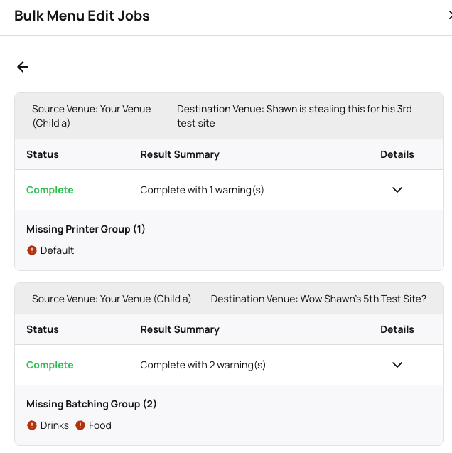 - Name matching: If batching/printer group names differ, items won’t auto‑assign. Fix names in the Child site and revalidate using the button on the copy modal. Remember the names should match exactly as it IS case sensitive.