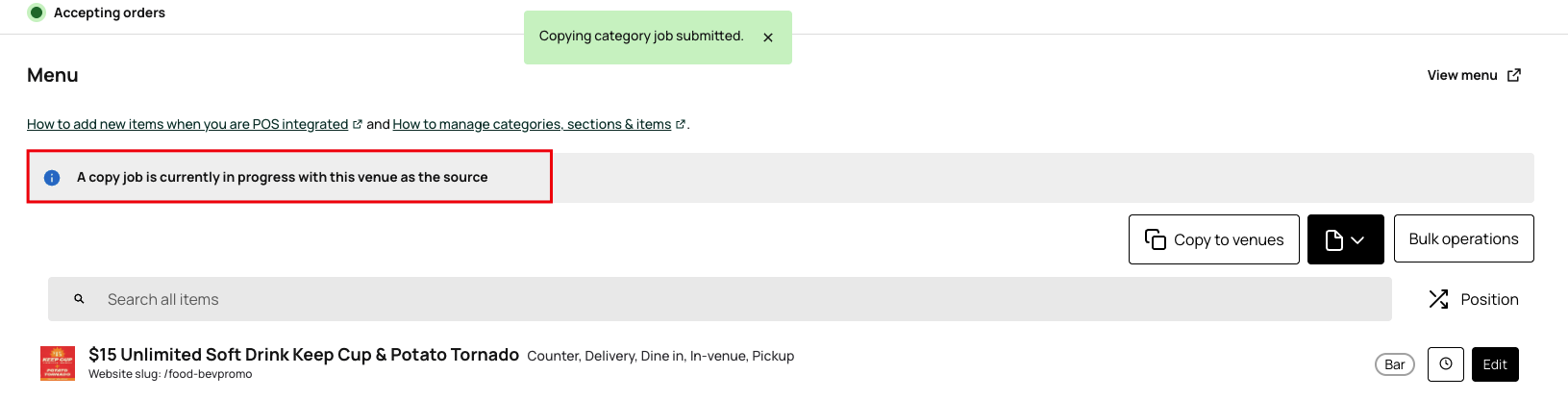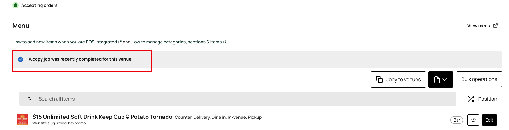 You can duplicate categories, upsell groups, price adjustments, and daily specials across venues that share the same POS integration, POS codes, SKU and price.