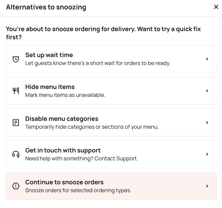 If none of these options resolve your situation, select Continue to snooze orders to temporarily pause the selected ordering type.
