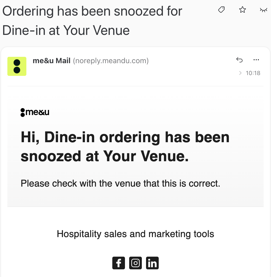 Receive more detailed and helpful email alerts when an ordering type is snoozed, so you always know what’s happening at your venues.