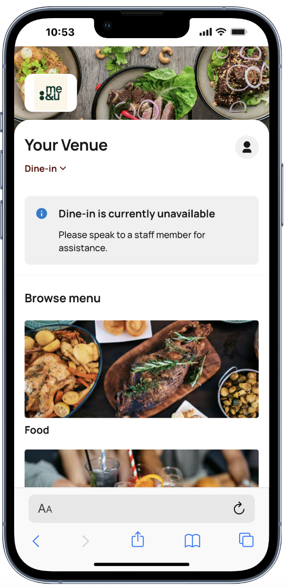 - Get in touch with support – This option opens the chat bubble so you can contact me&u Support if you need to turn off ordering for your venue indefinitely (example for renovations) or for a custom time range (example for seasons)