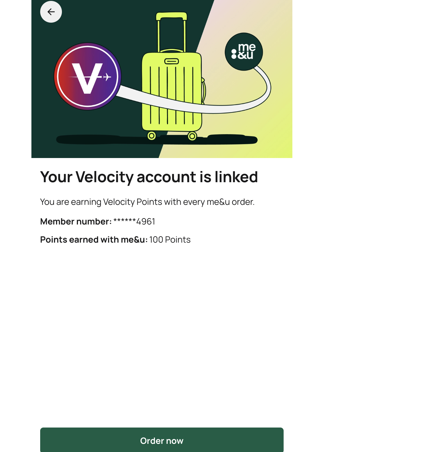 Guests can choose to use their Velocity Points to pay for their transaction when they order using me&u. They just need an eligible Australian-issued Visa card linked to their Velocity account. Pay with Points only works if the same card is linked to their Velocity app.
