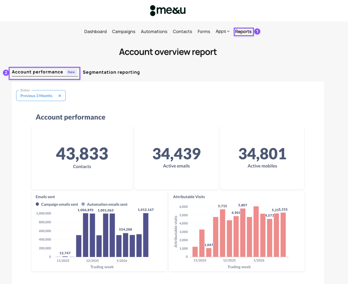 The Account Performance report gives you a complete view of how your Connect marketing is performing, this includes contacts, campaign performance, and automation impact; all in one place.