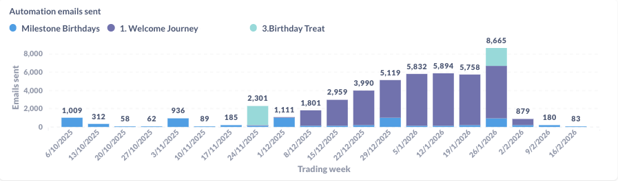 This chart shows how many automation emails were sent each week, broken down by journey type (e.g. Welcome, Birthday, Milestone).