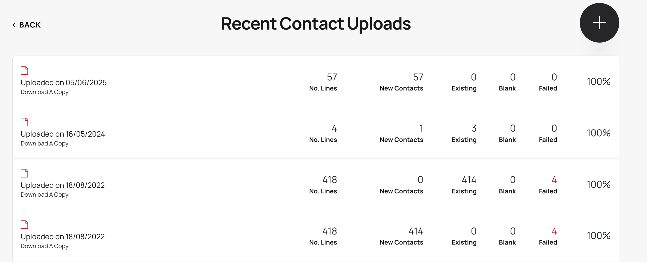 The View Previous Uploads page gives you a summary of every contact file uploaded to your account—showing how many contacts were added, updated, skipped, or failed. It acts as your audit trail for all imports.