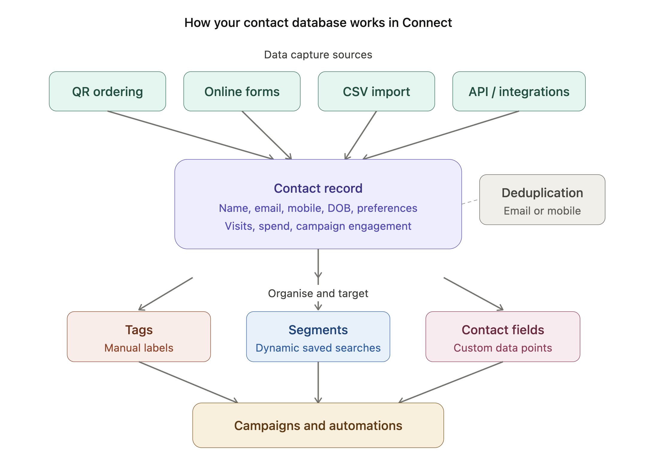 Your contact database is the foundation of everything you do in Connect, from sending targeted campaigns to building automations and tracking guest engagement. The more complete and organised your data, the better your marketing results.