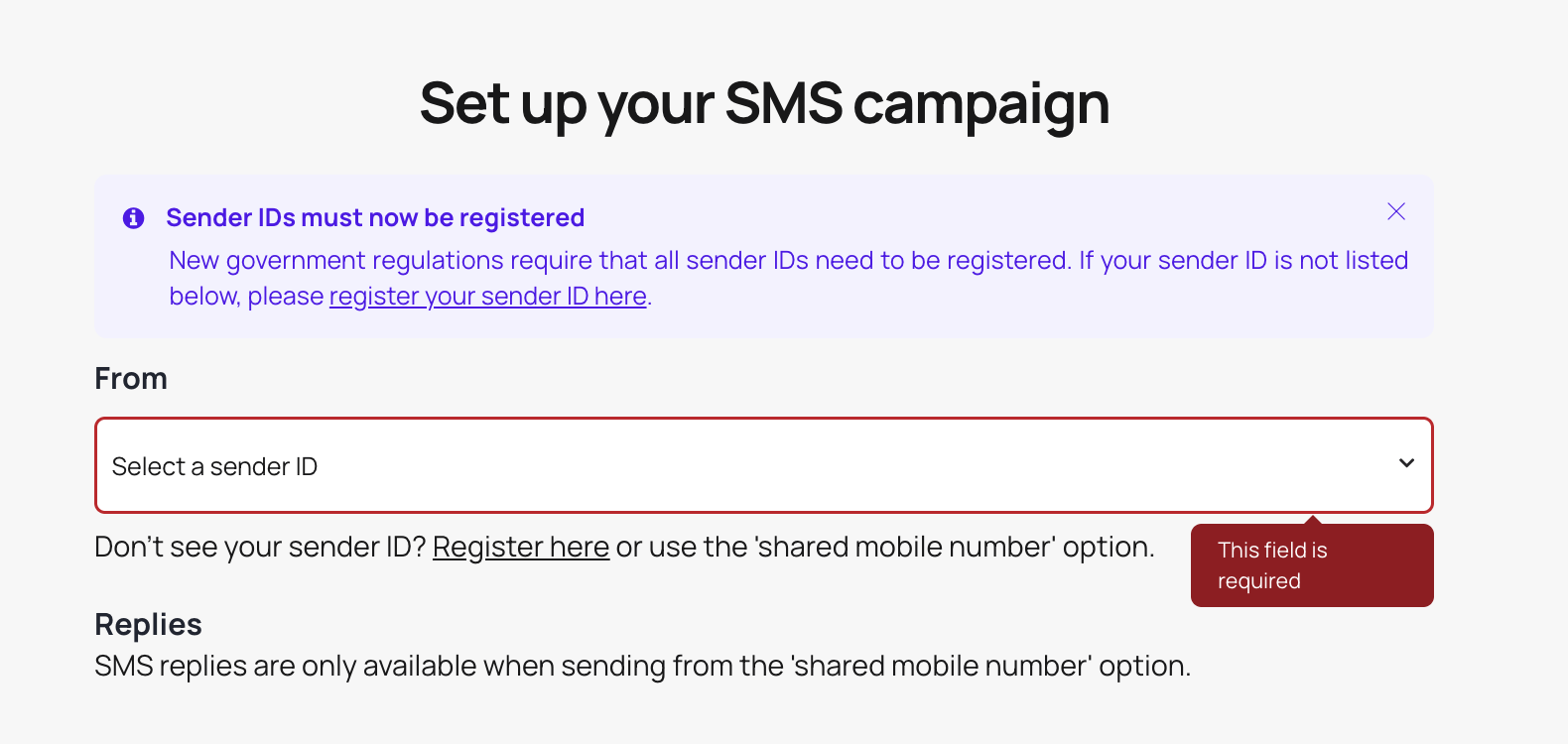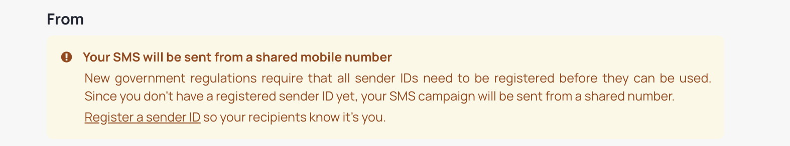 - Fix: Register a Sender ID via the link in the warning banner on the Set up your SMS campaign screen, or follow How to register your Sender ID. Approval can take a few weeks.