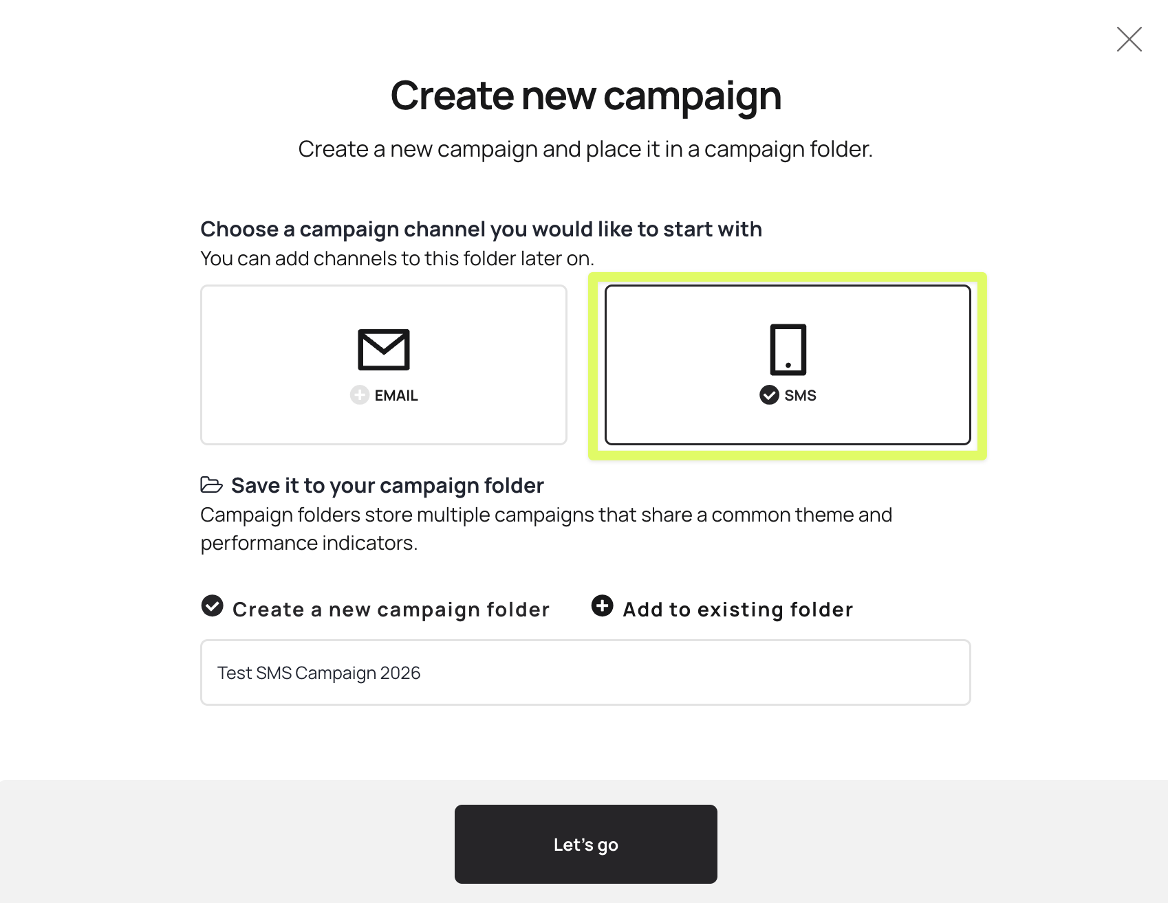 💡 Tip 💡 Campaign folders group related campaigns so you can compare performance across a theme (for example, "Weekend promos" or "Event reminders"). You can add more channels to the same folder later.