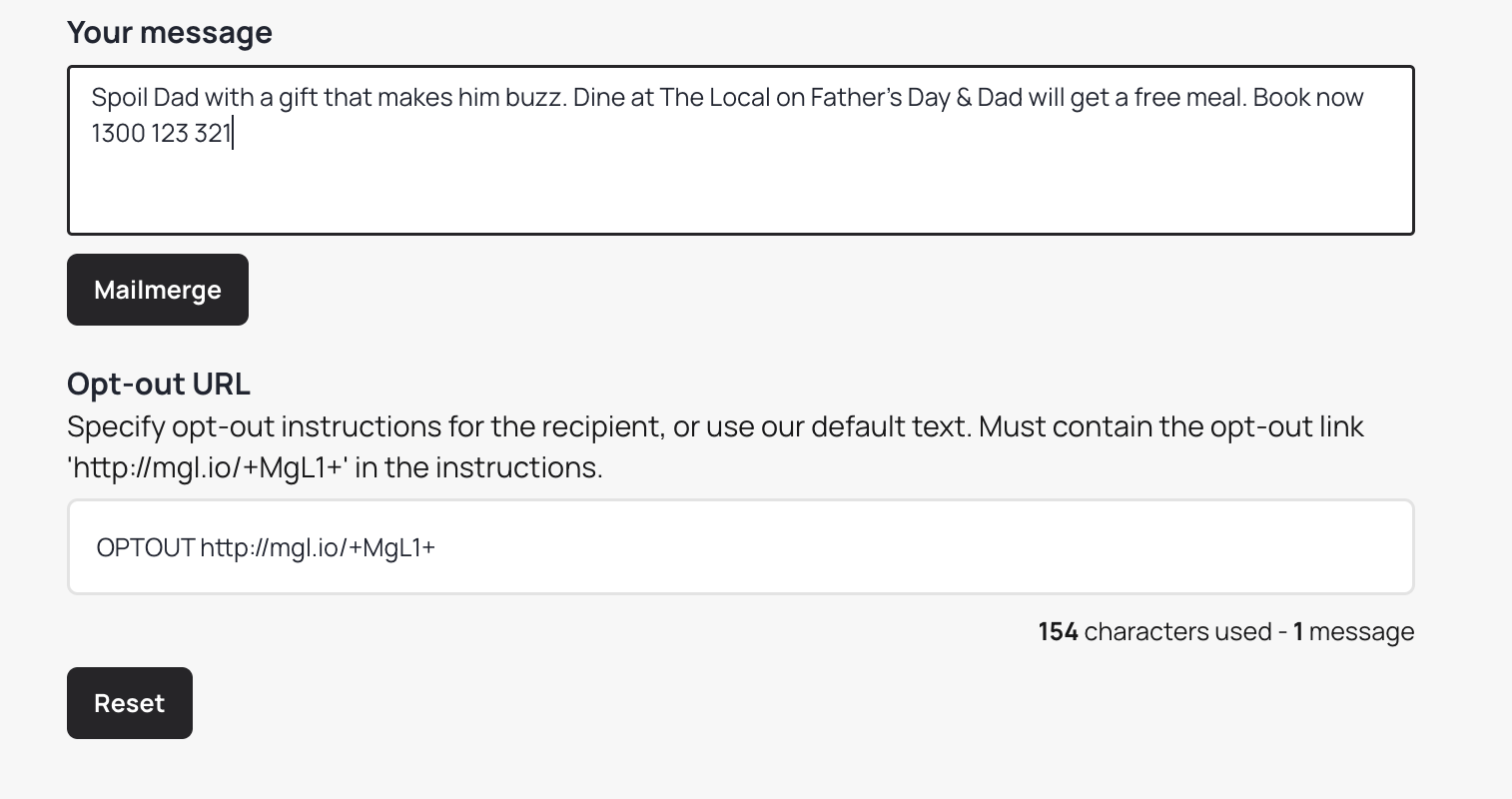 - Review the Opt-out URL: this is added automatically and must contain the opt-out link. You can customise the wording around it, but the link must stay.