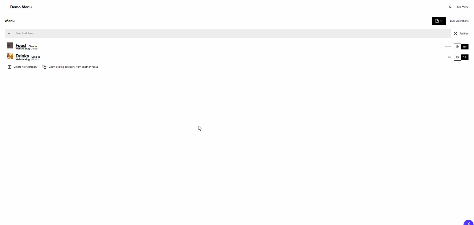 The Impos sync brings in all of your menu items from Impos into an intermediate page on me&u, called Bulk Operations. Through this page, you can select the items that you'd like to have on your me&u menu and import it.