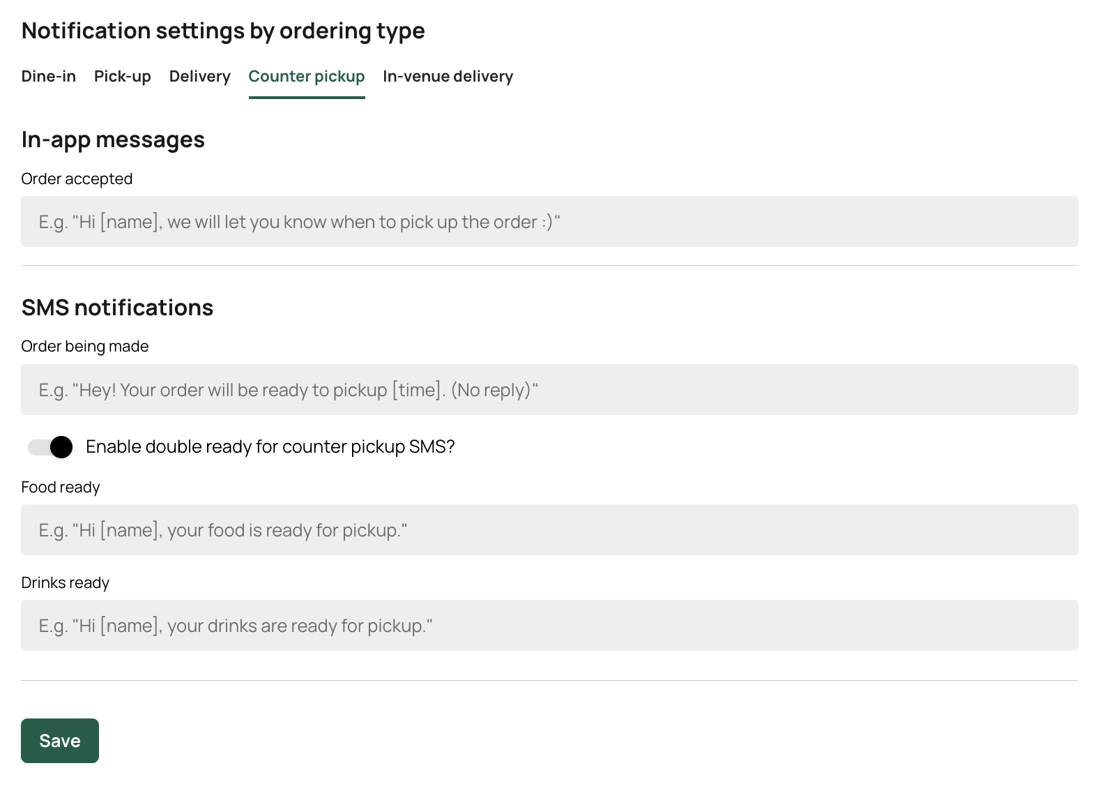Counter Pickup is used for orders that guests pick up at the bar, counter, or service window. When using Counter Pickup, you can also send 2 texts to the customers; one when food is ready and one when drinks are ready.
