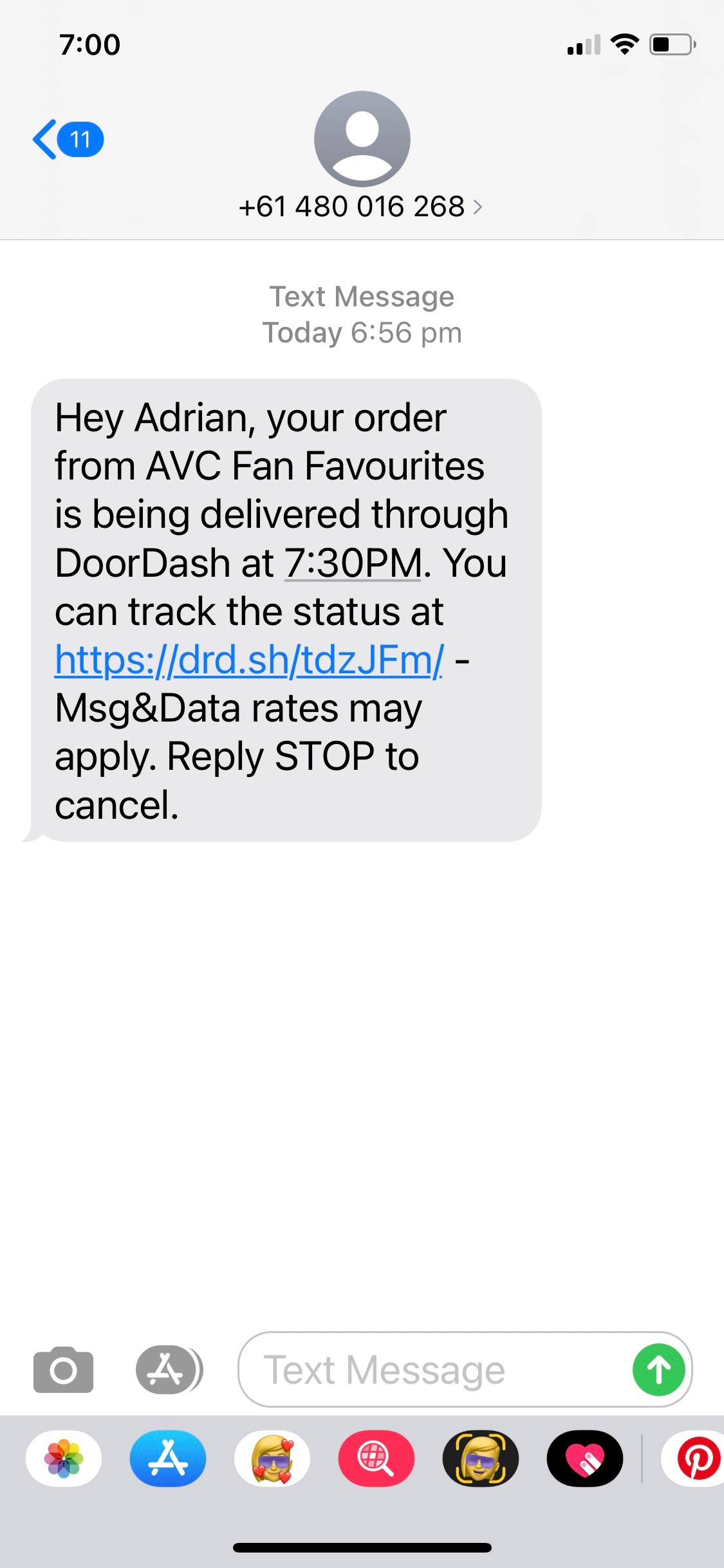 - The customer receives an SMS from DoorDash letting them know their delivery driver is approaching.