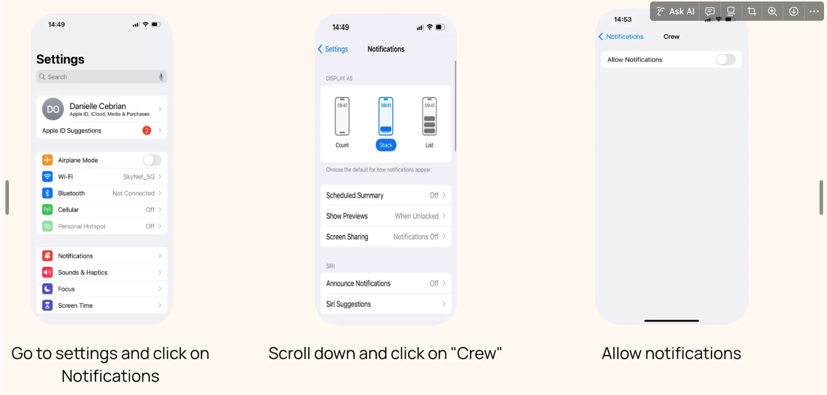 If Crew doesn’t have permission to send notifications, you won’t see alerts.