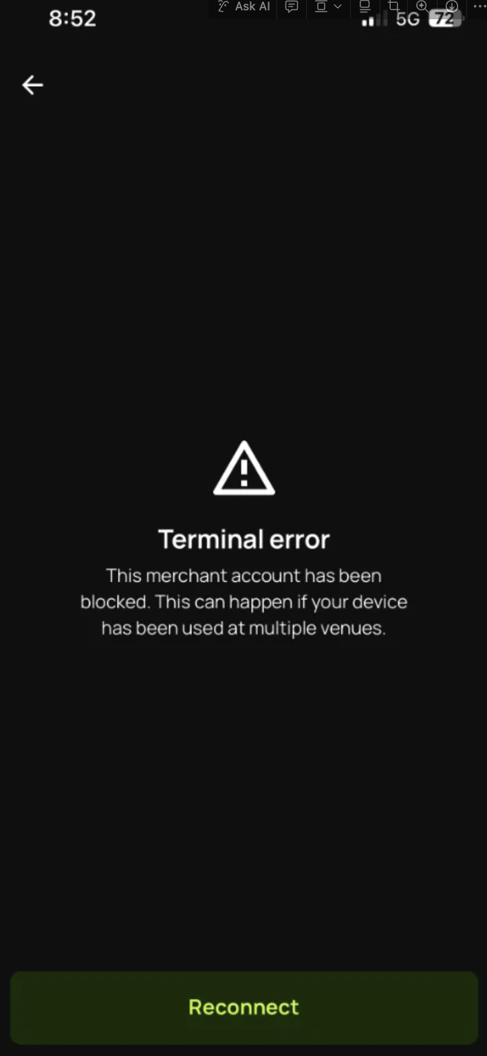 7. “This merchant account cannot be used to with the built-in card reader as it has been blocked. Contact support for details.”
